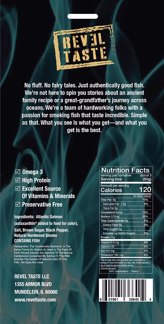 Hot Smoked Salmon Fillet Black PP 5 oz / 141.7g Natural Wood Filtered Smoked flaky pieces of salmon seasoned with black pepper
