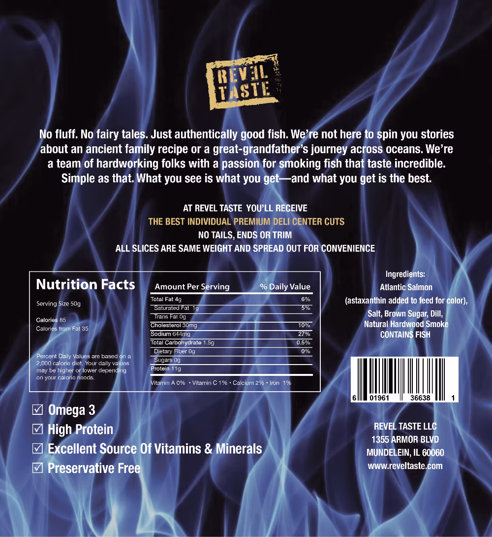 Lox 4 oz / 113 g (Cold Smoked Salmon) Natural Wood Filtered Smoked Our Gravlax spice blend combines the perfect balance of salt, sugar, and dill to enhance the mild flavor of Atlantic salmon. Cold smoked with fruitwoods and hardwoods, this thinly sliced and skinless salmon offers exceptional value and a truly unique taste experience. Perfect for sandwiches, wraps, or tasty appetizers.